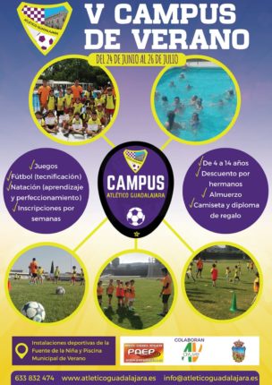 La sexta edición del Campus de Verano organizado por el Club Atlético Guadalajara abre sus inscripciones. La actividad, dirigida a niños y niñas entre 4 y 16 años, se desarrollará del 28 de junio al 30 de julio en el Complejo de la Fuente de la Niña, realizándose actividades de tecnificación en fútbol, juegos, gymkanas y mucho más. Como en ediciones anteriores, podrá realizarse la inscripción por semanas.